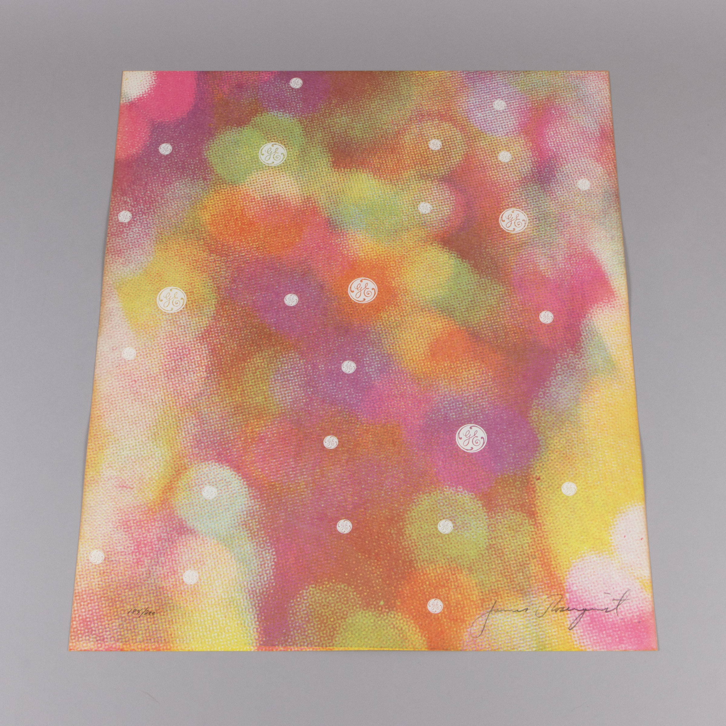 Circles of Confusion (1965) by James Rosenquist is a vibrant Pop Art screenprint on light board, 61 × 50.8 cm (24 × 20 in). Layers of glowing pink, orange, yellow, and green are punctuated with circular motifs featuring the GE (General Electric) logo. By inserting this corporate symbol into an abstract, dreamlike field, Rosenquist blurs the line between branding and fine art, a hallmark of his style.